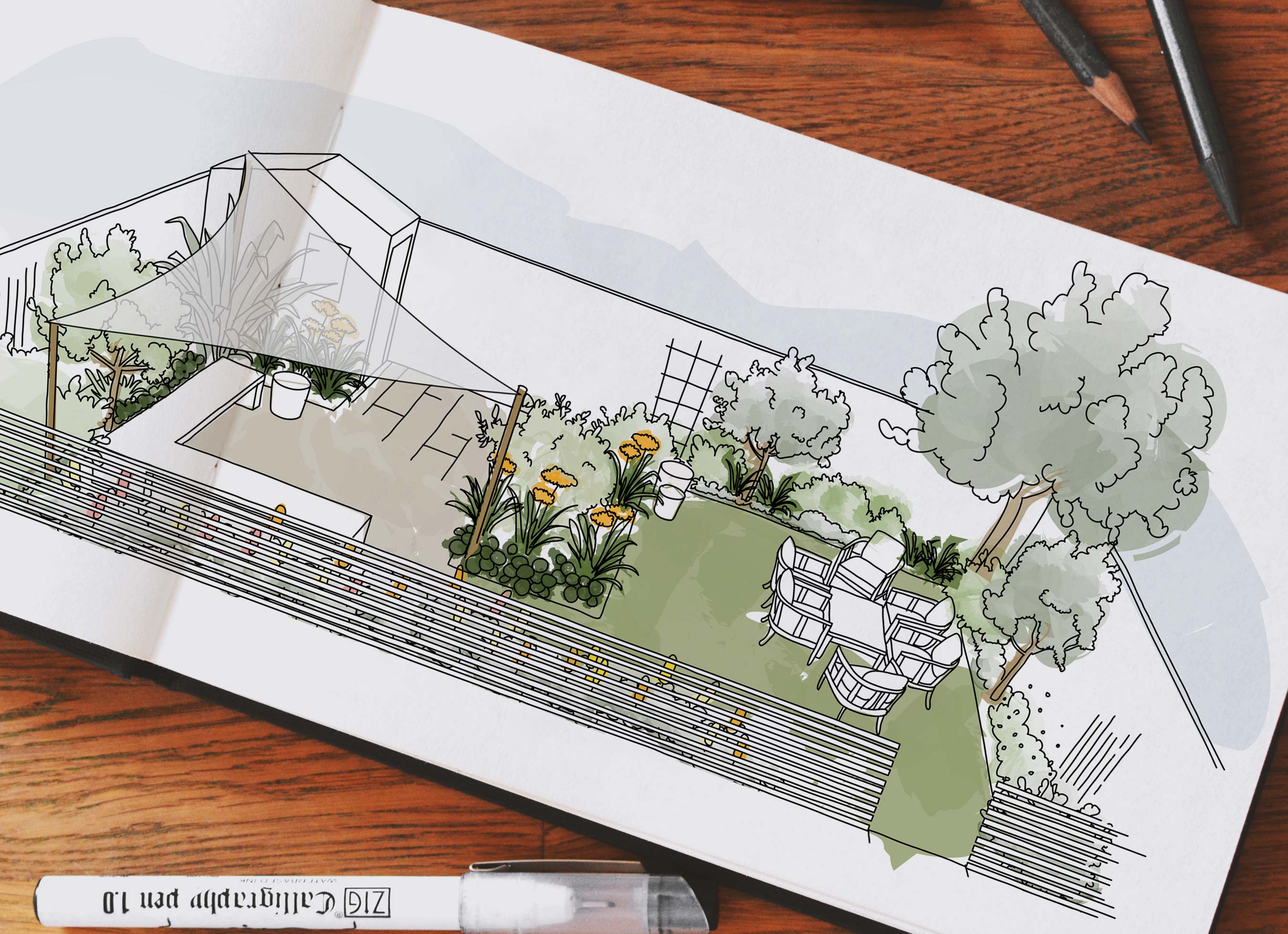 Residential landscape designs visualised and then hand-drawn digitally in a loose sketch-style from 2D pre-viz and client notes.